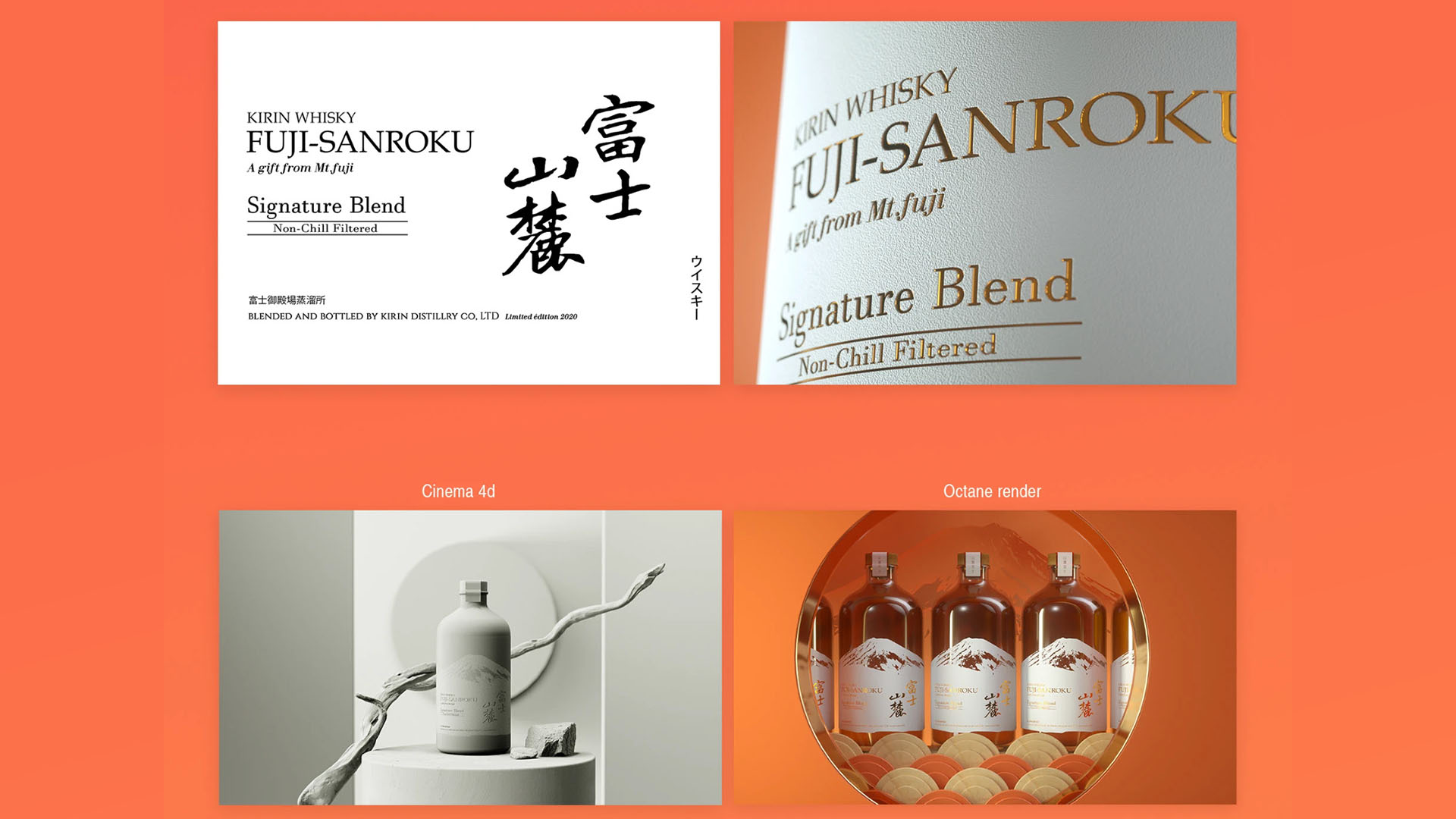 Extensive research was conducted to accurately recreate the packaging using Adobe Illustrator. The model was developed to achieve a high level of detail on the bottle, including elements such as paper grain textures and engraved internal typography.